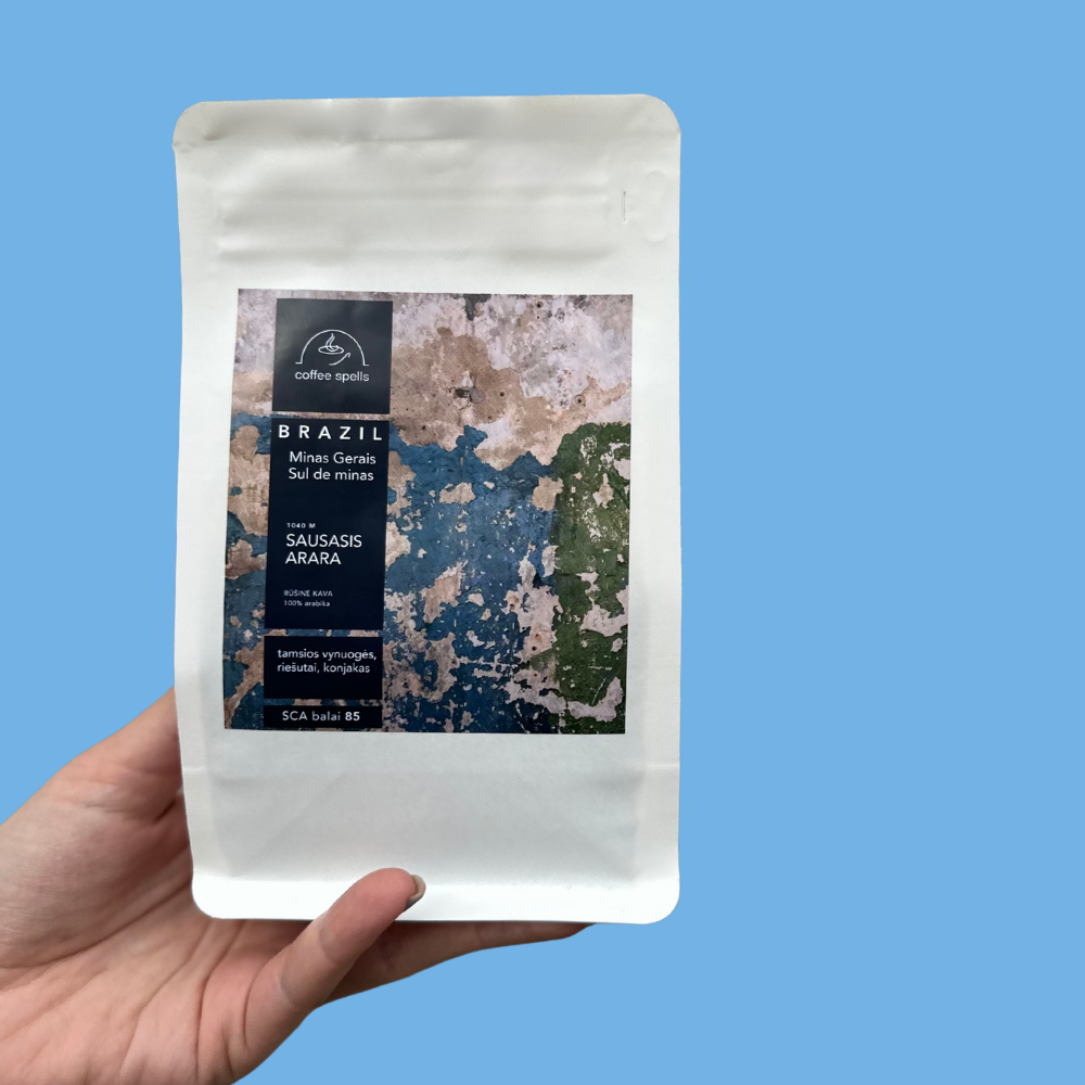 Gerdami šias šviežiai skrudintas rūšinės kavos pupeles iš Brazilijos, pamėginkite pajusti: tamsios vynuogės, riešutai, konjakas